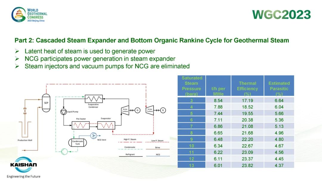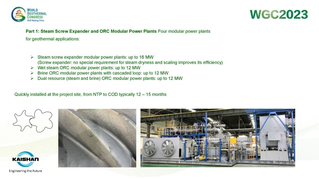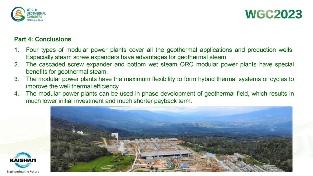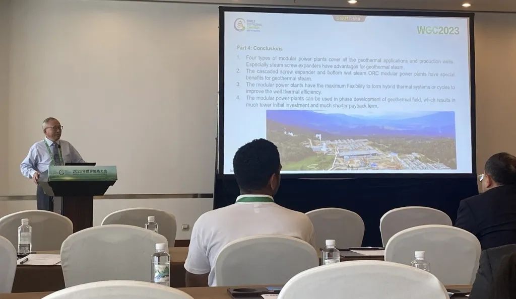 9月16日,公司總經(jīng)理、開山地?zé)峋谀K發(fā)電技術(shù)創(chuàng)始人湯炎博士參加2023年北京世界地?zé)岽髸?huì)(WGC),并受國際地?zé)釁f(xié)會(huì)(IGA)首席執(zhí)行官M(fèi)arit Brommer女士邀請,做了題為《使用地?zé)崮K電站提高地?zé)峋a(chǎn)量》(Improving Well Power Output Using Modular Geothermal Power Plants)的專題報(bào)告。