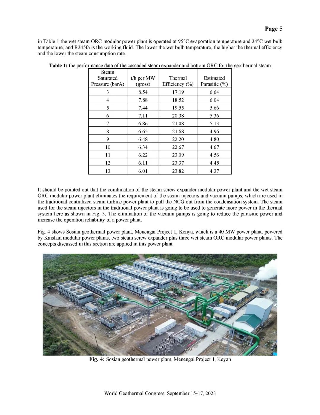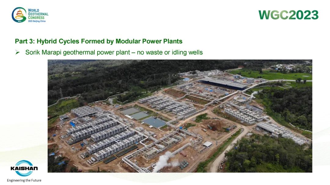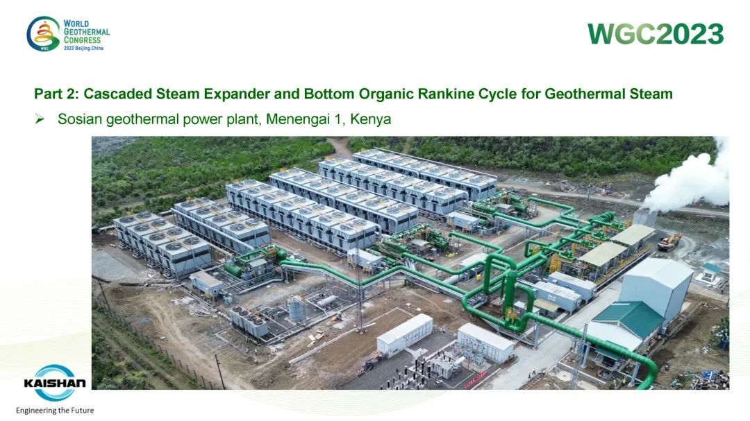湯炎博士著重介紹了由開山EPC建設(shè)的肯尼亞Sosian-Menengai地?zé)犭娬炯伴_山自主開發(fā)、建設(shè)、運(yùn)營的Sorik Marapi地?zé)犭娬境晒Π咐osian-Menengai地?zé)犭娬静捎谩罢羝蛎洐C(jī)+濕蒸汽ORC膨脹機(jī)”模塊電站串級(jí)循環(huán),無需采用傳統(tǒng)中央電站分離不凝性氣體的蒸汽噴射器和真空泵,從而降低了電站寄生負(fù)荷、提高其發(fā)電效率。Sorik Marapi項(xiàng)目是公司各類型模塊電站的集大成者,高壓蒸汽井、低壓蒸汽井、熱水井熱源均可得到充分利用,進(jìn)而使項(xiàng)目實(shí)現(xiàn)“無閑置低壓/低溫井”。模塊電站“量體裁衣”式的解決方案通過提高井熱效率改善了地?zé)衢_發(fā)的經(jīng)濟(jì)性,也通過獨(dú)樹一幟地有效利用低壓地?zé)峋盁崴@著降低了資源鉆探的單位成本。