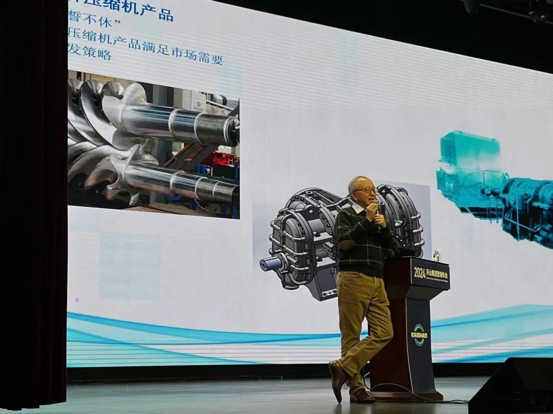 下午,壓軸演講是湯炎總經理所做的“開山技術發展與趨勢”專題報告。湯總的演講報告精彩無比,贏得全場陣陣掌聲。他著重介紹了開山無油螺桿空壓機的創新技術特征,介紹了最新一代超高效壓縮機的測試數據,他宣布,即將在2024年全面推出的新一代超高能效空壓機比國家最新頒布的一級能效比功率數值還要低7.9-11.4%,“開山將再次改寫中國的能效等級”!