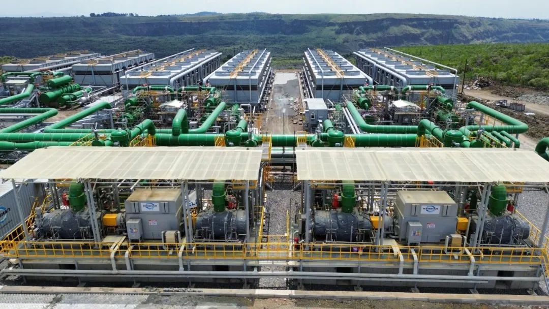 35 MWe 的 Sosian Menengai 地?zé)岚l(fā)電廠于 2023 年 8 月投入使用。該電廠使用兩臺開山地?zé)嵴羝磯郝輻U膨脹機(jī),將廢氣排放到三個有機(jī)朗肯循環(huán)裝置中。圖片來源:開山集團(tuán)